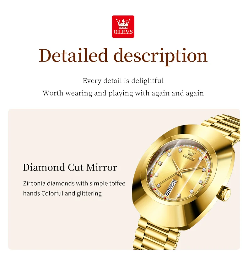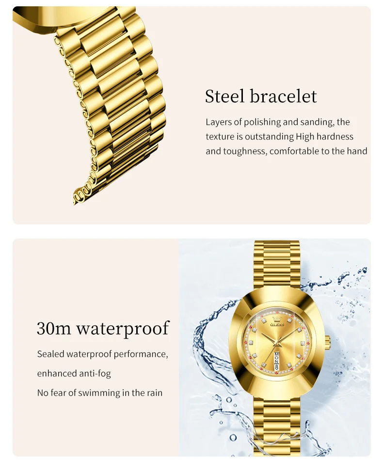 - Design Sofisticado: O mostrador oval de 44mm com acabamento dourado e detalhes de diamante proporciona um toque de classe ao seu visual.